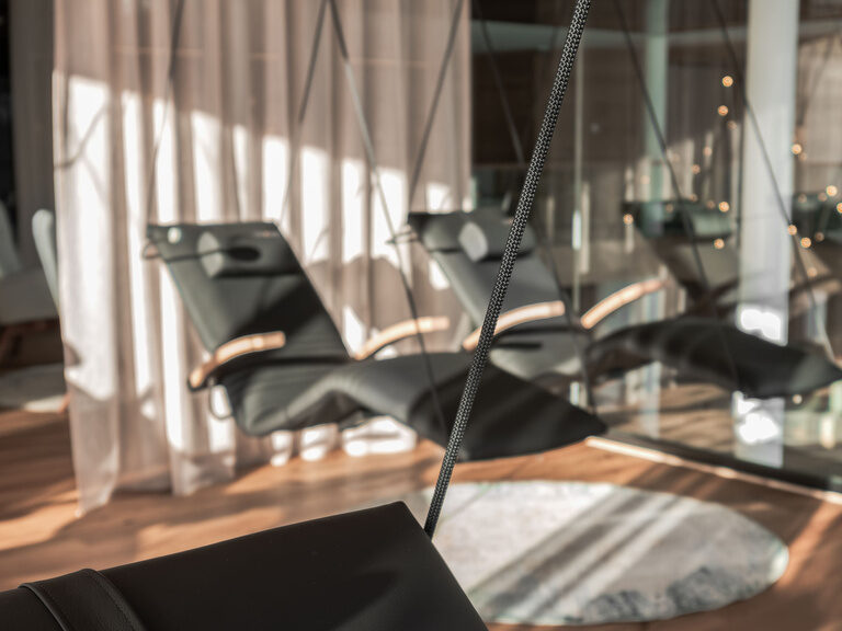 Mehrere moderne und schicke Sitzmöglichkeiten laden im Wellnesshotel Tonihof zum Verweilen ein.